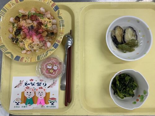 こんにちは、藤井病院栄養科です(^^) 今回は、3月3日に提供したひな祭りの献立についてご紹介します✨ 今回のメニューはこちら↓ ひな祭りと言えば散らし寿司が定番です。 今年は花形の押し寿司の上にうなぎ、絹さや、えび、錦糸卵、鶏そぼろなどを乗せて豪華…