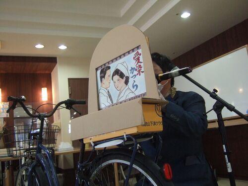 藤の華デイサービスです。 人気イベントの一つ『紙芝居』をしました♪ チリンチリンとベルを鳴らしながら、 読み手が紙芝居台を乗せた自転車を押してやってきます! 今回は『愛染かつら』と『安珍清姫』の豪華2本立て! いつもながら…『劇団・藤の華』の登場…