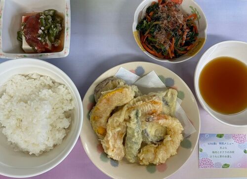 介護医療院 菜の花・菜の花デイケア栄養科です。 5月に天ぷらとえんどうご飯を提供しました。 嗜好調査で人気のあった天ぷらは大好評! 配膳中に「わぁ~!」と歓声が上がっていました。 副菜の梅とおくらの冷奴がさっぱりしていてこちらも好評でした。 そ…