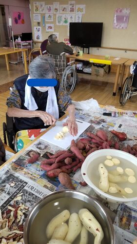 老健華 入所・リハビリです。 Part.1で収穫したサツマイモを使って、10月中旬、お料理をしました。 今年も芋ようかん、芋団子を作ります。 見てください!この包丁さばき! なんと、御年105歳!! 硬いサツマイモを「よいしょー」と声を出しながら、力強く切…