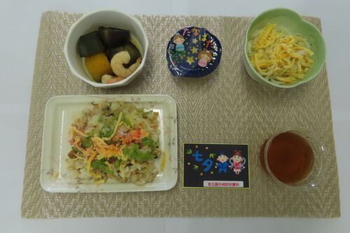 こんにちは 泉北藤井病院 栄養科です 少し投稿が遅くなりましたが 7月7日 七夕の日に行事食を行いました。 献立は ・ちらしずし ・煮付 ・七夕そうめん ・七夕ゼリー です。 主食がお粥の方にはちらしずしの代わりに天ぷらを提供しました。 また、通常の食事…
