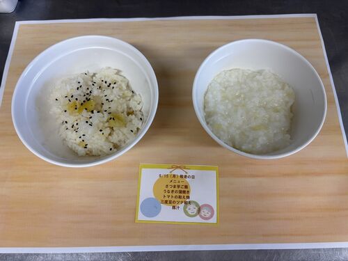 こんにちは☀️ 介護医療院 菜の花、デイケア 菜の花 栄養科です! 9月は敬老の日!!! ということで、敬老御膳を提供しました メニューは さつまいもごはん・さつまいものお粥 うなぎの蒲焼き トマトの塩昆布和え 三度豆のツナ和え 豚汁 でした✨✨ 今回メイ…