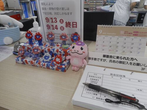 こんにちは。 岸和田藤井病院療養病棟です。 関西万博もいよいよ終盤!! 当病棟ではミャクミャク達が元気いっぱい面会に来られた 皆さまをお出迎えしています。 患者ご家族様からも「かわいい!」と、大好評。 今回は”りょっち”ともコラボしてさらに賑やか…