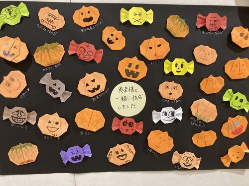 こんにちは、藤井病院回復期病棟です。 回復期病棟では季節を感じていただけるよう 壁面装飾を行っています。 今月はハロウィンです。 患者様に参加していただき、折り紙で作ったカボチャに 顔を書いてもらいました。 中には柿のようになっているものもあり…