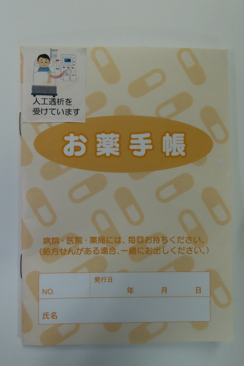 と書いてあるシールを作成し、透析患者様のお薬手帳に貼って、透析されていることが一目で分かるようにしました。
