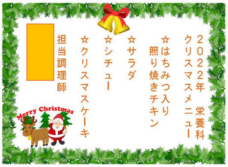クリスマスメニューの献立を詳しく知って頂けるよう、患者様一人一人にメニューカードを付けて提供しました。