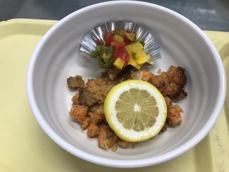 煮込みハンバーグ、ブロッコリーのかにあんかけ、クリーム煮でした。
