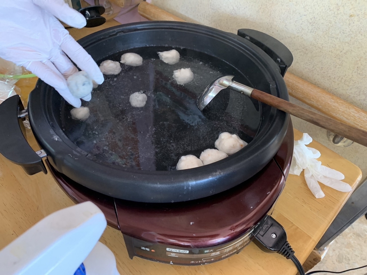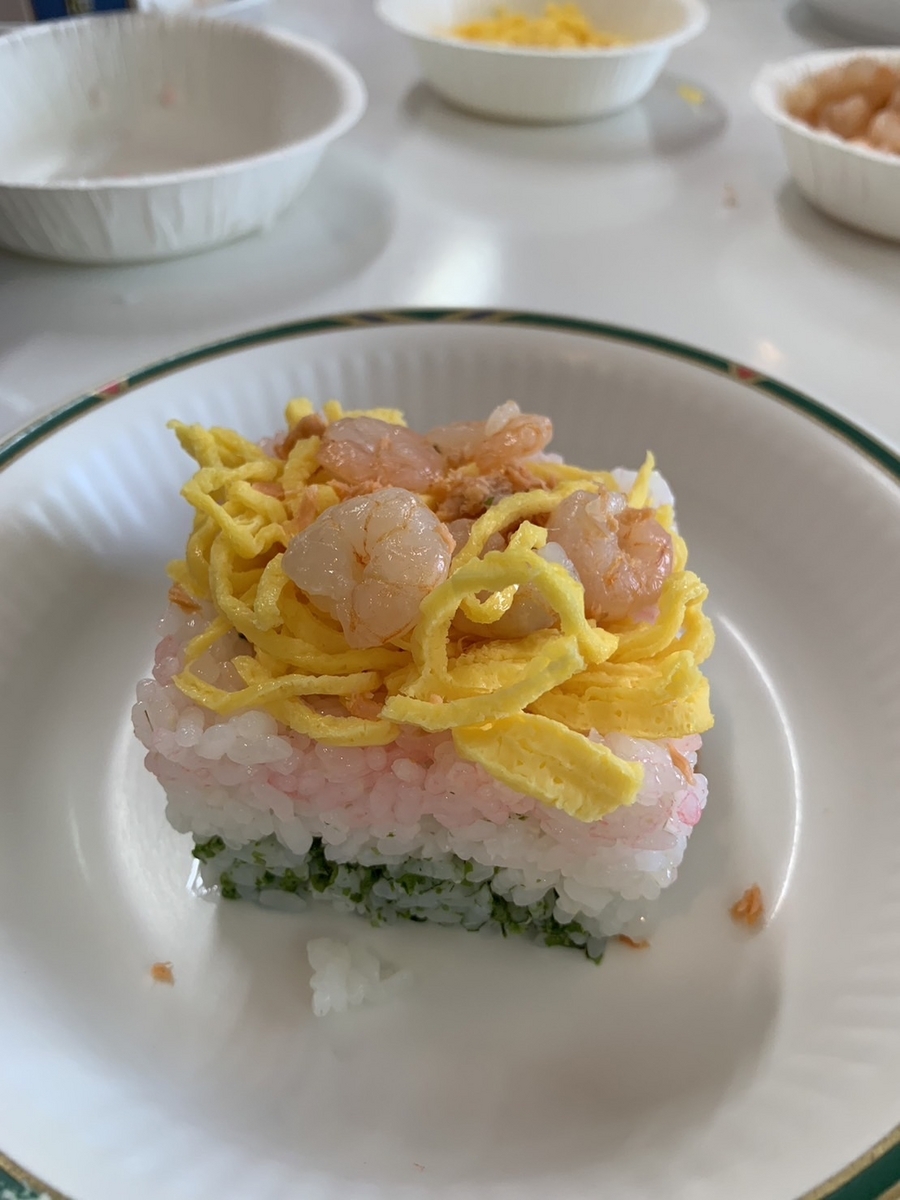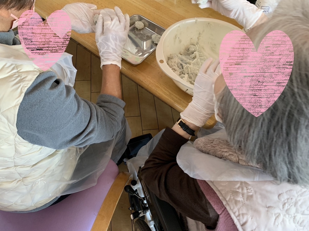 利用者様と一緒にちらし寿司、おすましに入れる具材『エビシンジョウ』を手作りしました。皆んなとても嬉しそうにイキイキしながら作っていました。
