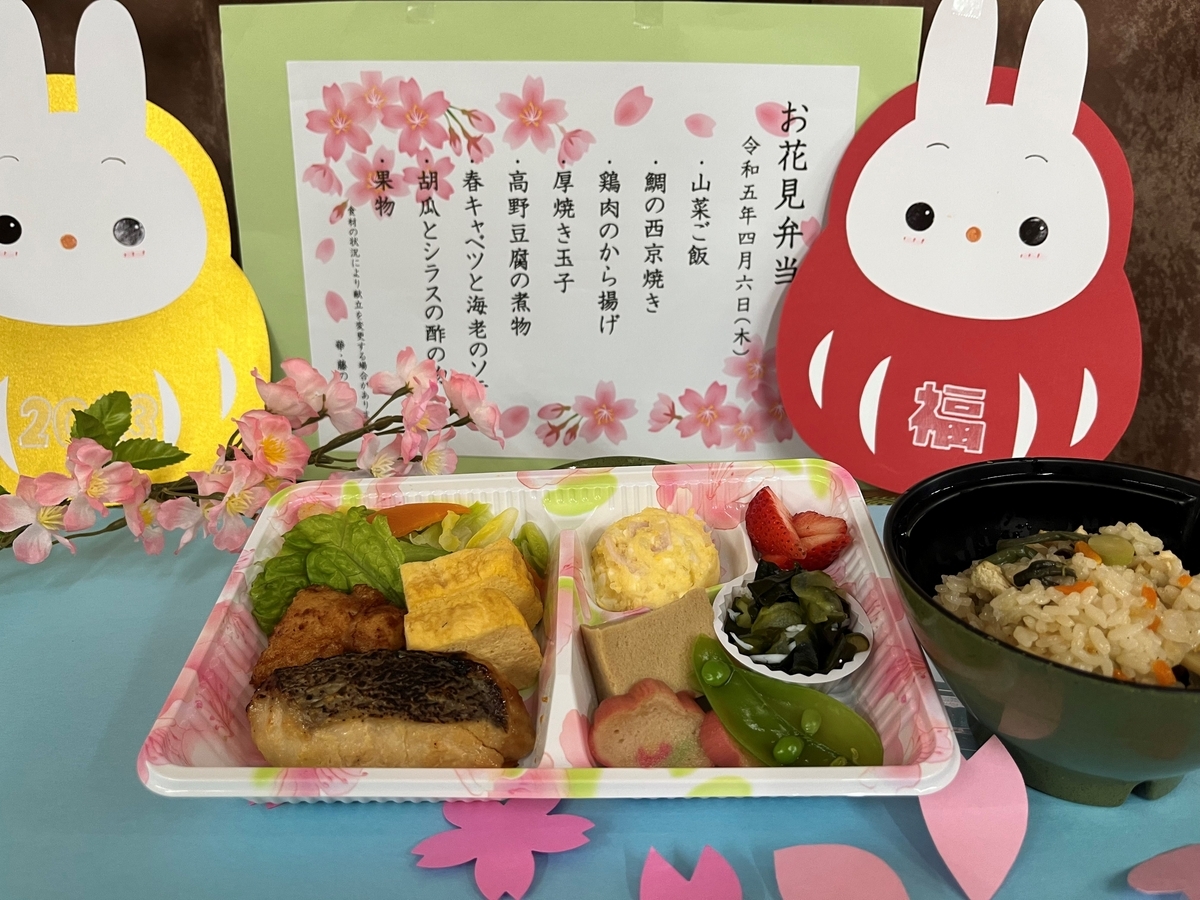 2023-04-11 お花見弁当 イベント デイケア デイサービス リハビリ 介護 栄養科 有料老人ホーム 楽しい 看護 老健 華 藤の華 藤の華栄養科です 今回はお花見弁当のご紹介です。(老健華通所・入所・有料老人ホーム藤の華・デイサービスセンター藤の華) 春キャベツのソテーや釜揚げシラスを使用した酢の物、山菜ごはん等の春の味覚を取り入れ、味わって頂きました。 老健華の桜も満開でした