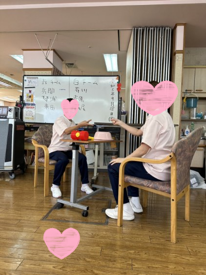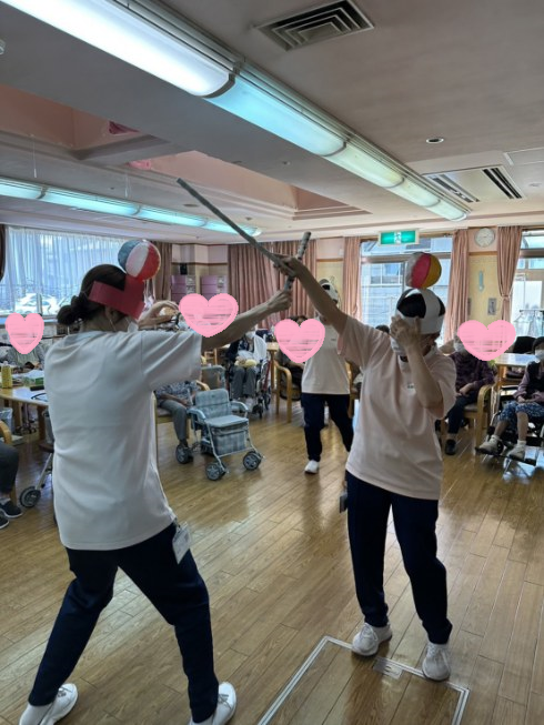 2023-09-28 老健華通所リハの敬老会 イベント デイケア リハビリ 介護 楽しい 看護 老健 華 老健華通所リハビリです 日頃の感謝の気持ちを込め、利用者様に笑顔になって頂きたく 職員対抗のゲームイベントを開催しました。 紅白に分かれ『目隠し風船割ゲーム』 職員真剣そのもの!!! 続きまして 『叩いてかぶってじゃんけんぽん』 これも、負けず嫌いの職員が・・・ 利用者様も「がんばれ!!がんばれ!!」と声援で 見事、紅組が勝ちました。 皆様、大笑いで大好評でした。