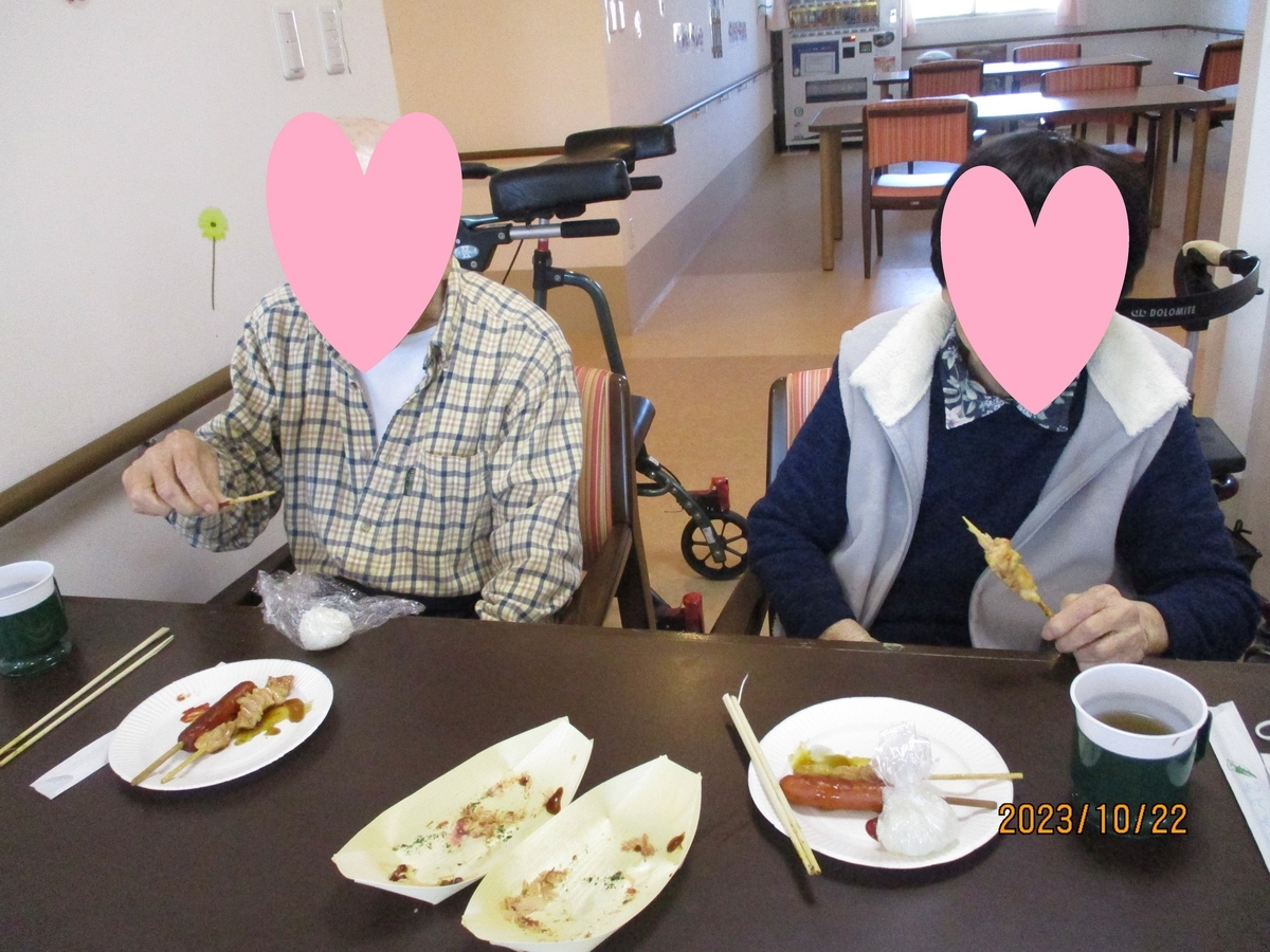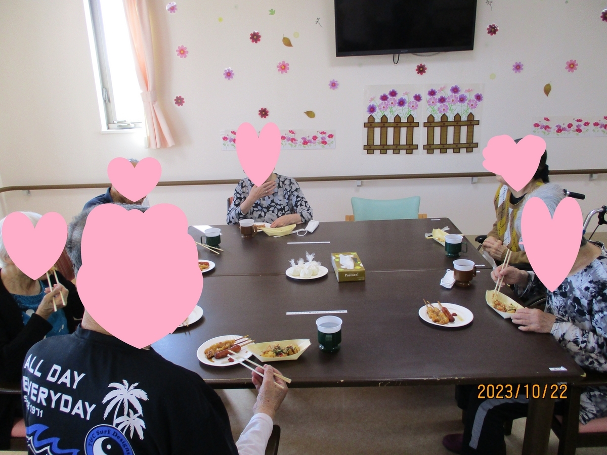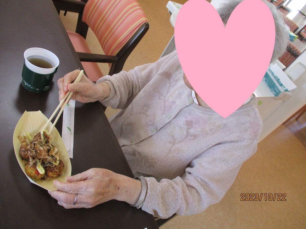 2023-12-06 コスモスの食事イベント イベント コスモス 有料老人ホーム 栄養科 看護 介護 有料老人ホームコスモスの家田尻です。 今回は10/22に栄養科協力のもとたこ焼き、焼き鳥 フランクフルト、おにぎりの食レクを実施しました。 たこ焼きが大人気でたくさんの入居者様が おかわりをしてくださいました♪ 焼き鳥もフランクフルトもおにぎりも「おいしい」「おいしい」 と言ってくださり大盛況で終わりました。 入居者様の楽しそうな笑顔が見れて良かったです。 これからも色々なイベントをしていきます♪