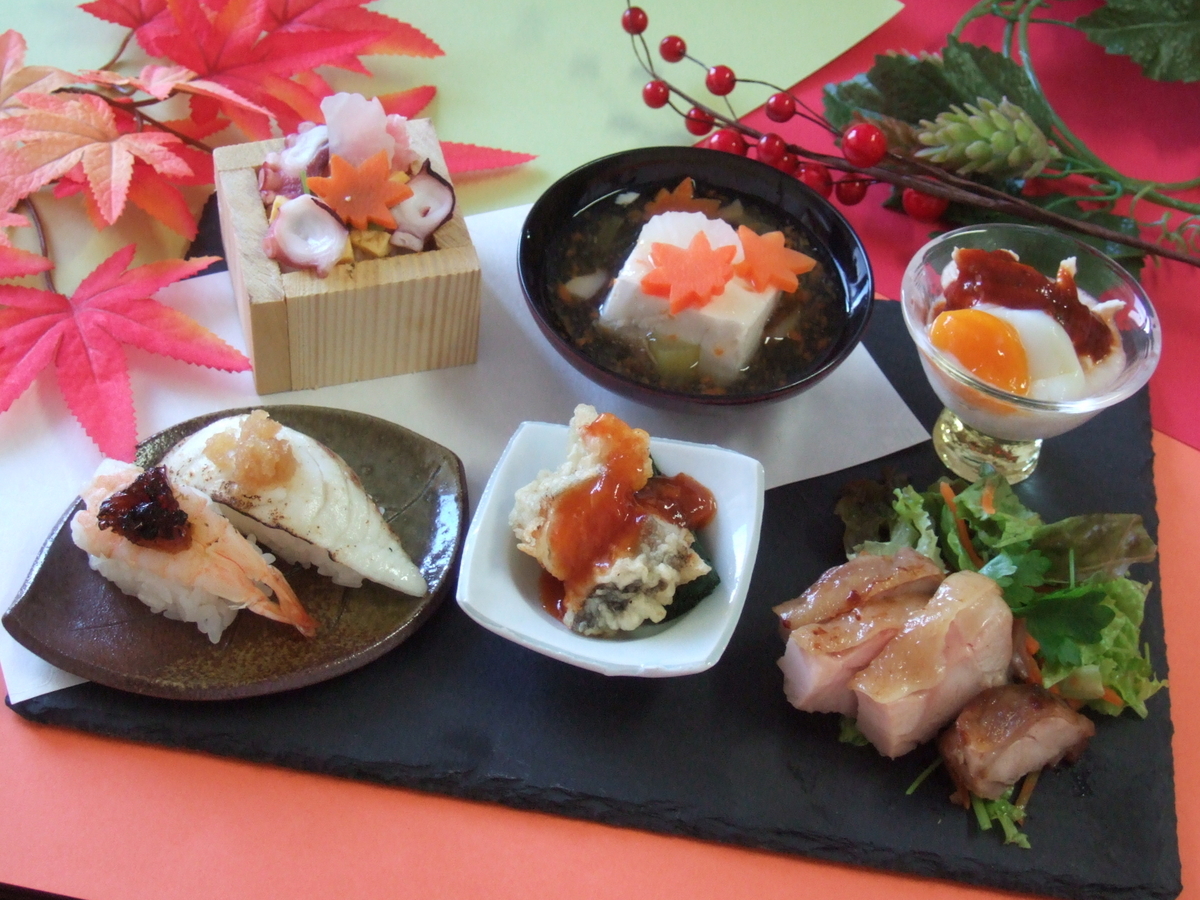 「握りずし、鶏パリパリ揚げ、鱈ちり、鶏ユッケ、あんかけ豆腐」