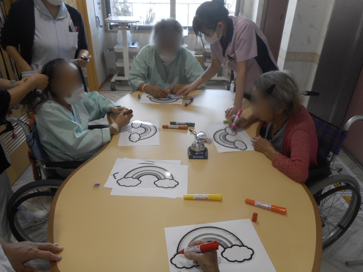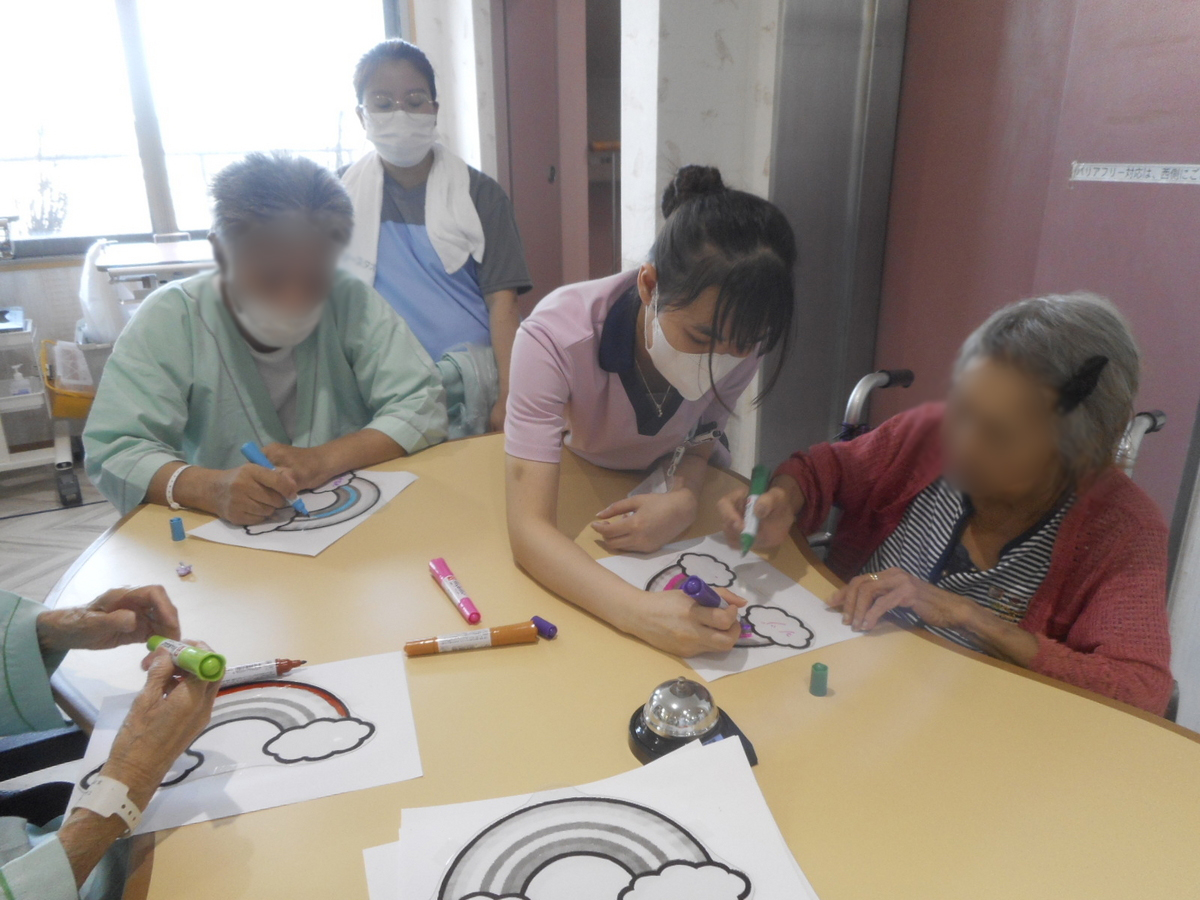 虹の下絵にそれぞれ好きな色を塗り、名前入りの虹のキーホルダーに