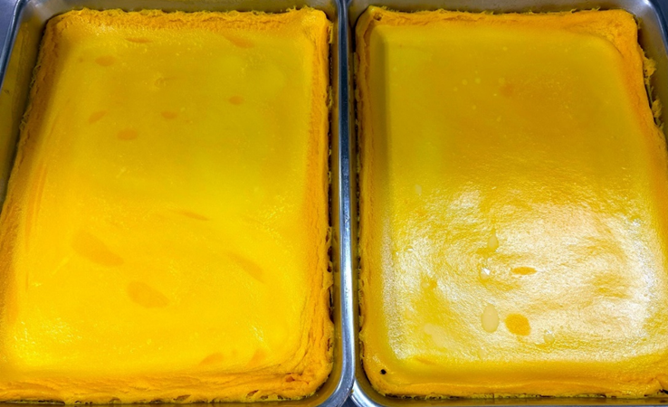 かぼちゃプリンは大きく焼いて一人分に切りわけます。