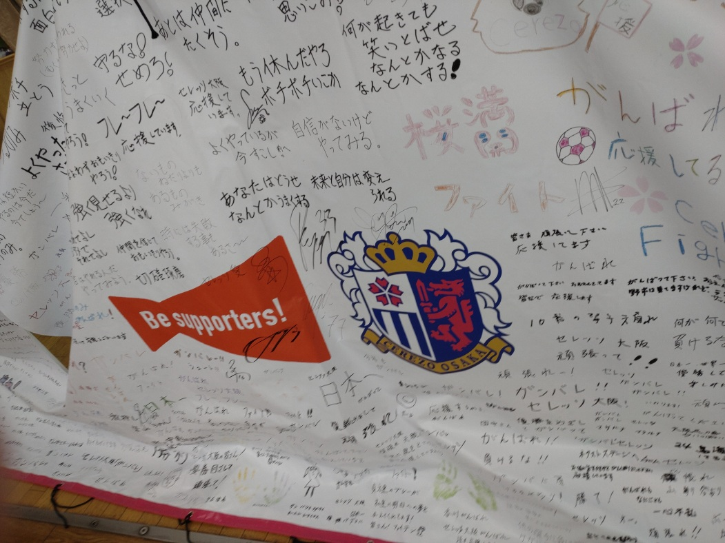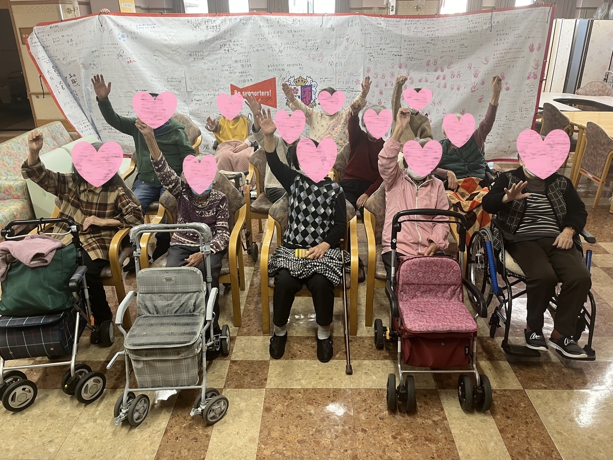 2025-01-04 セレッソ大阪応援 イベント デイケア リハビリ 看護 老健 華 介護 介護老人保健施設華 通所リハビリテーションです。「Be supporters!」寄せ書きが華へきました。利用者様と写真撮影!!